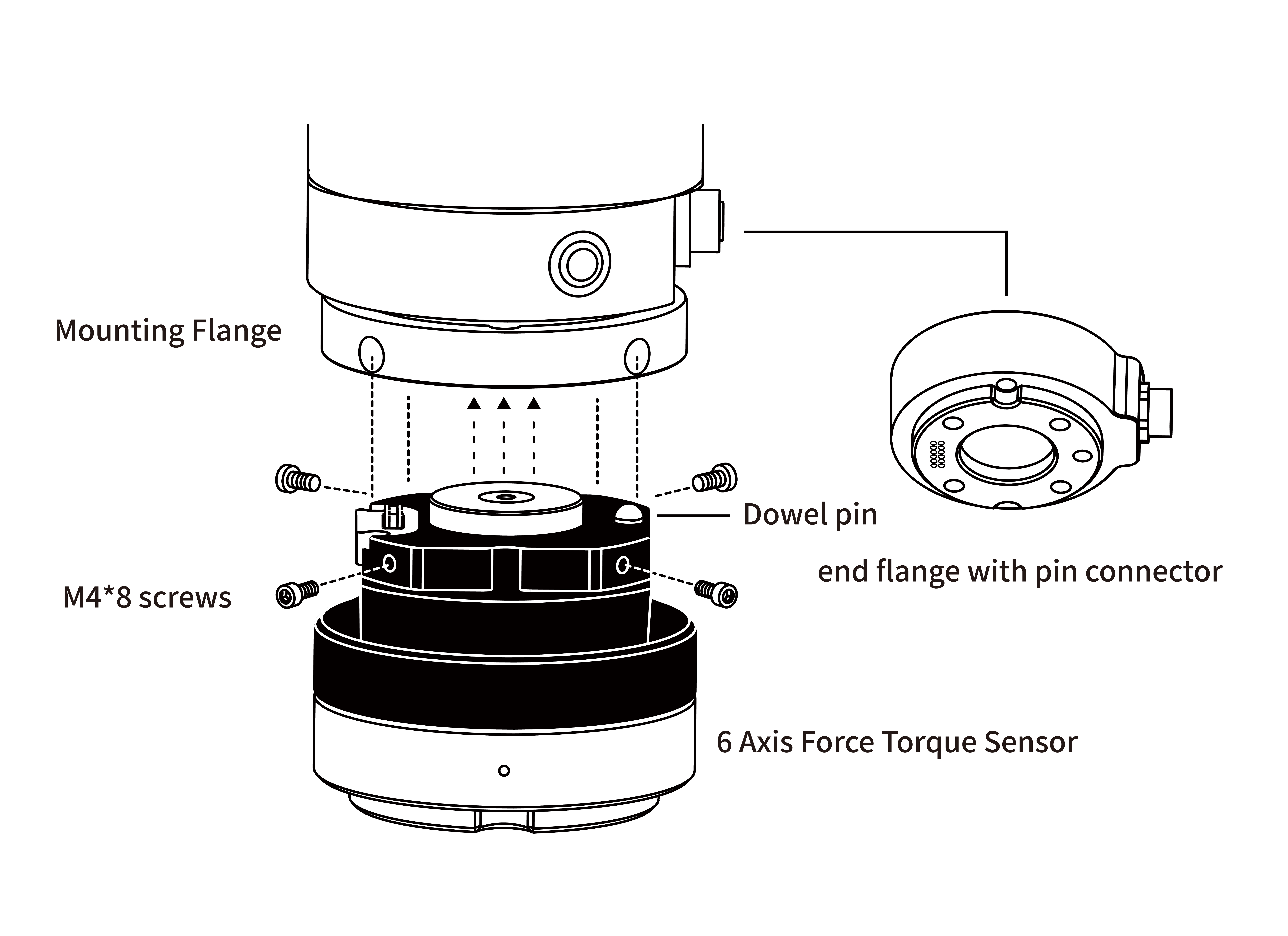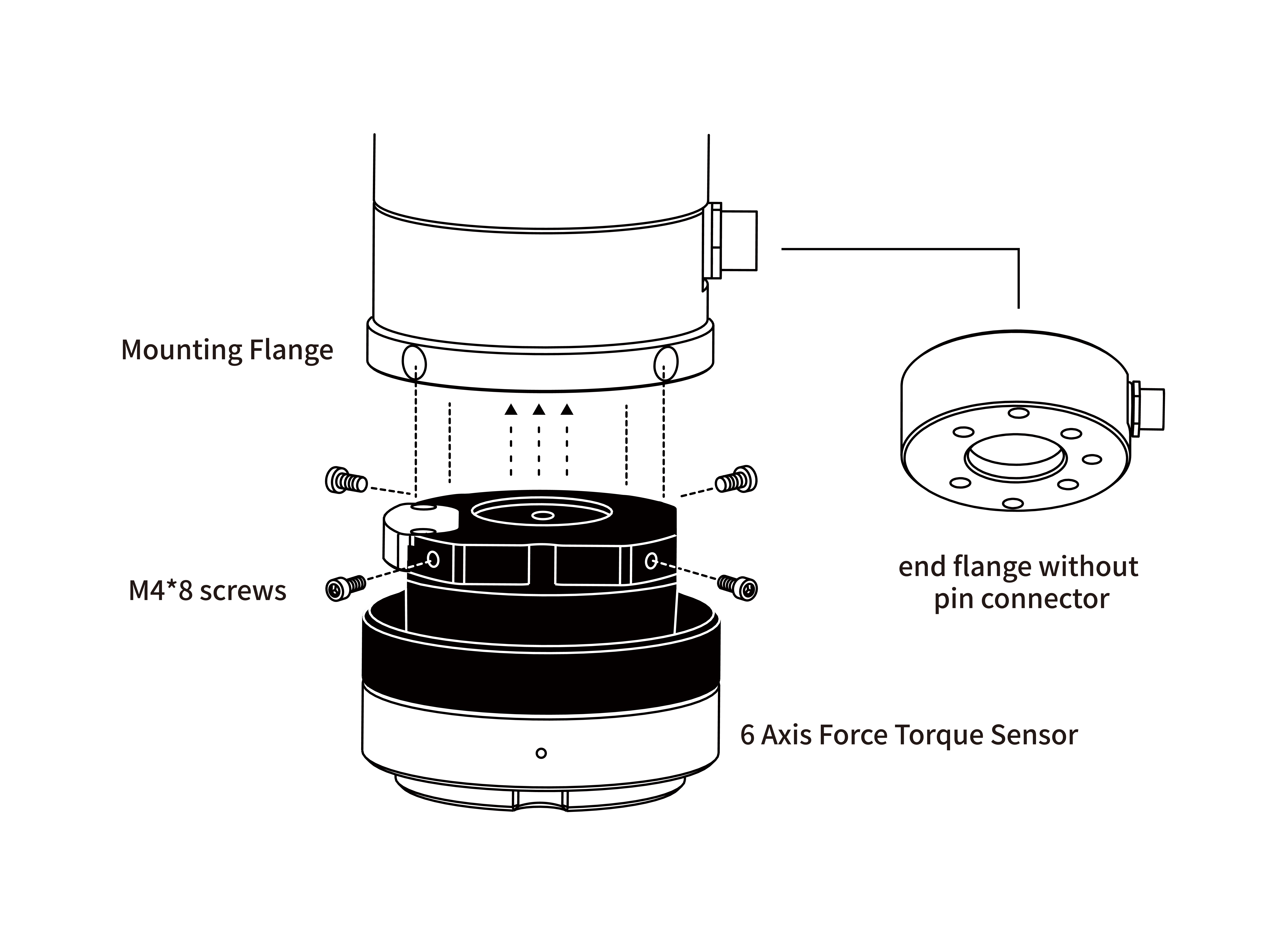 - Install the 6 Axis Force Torque Sensor on the Mounting Flange using 4 M4*8 screws(spring washer must be used together).