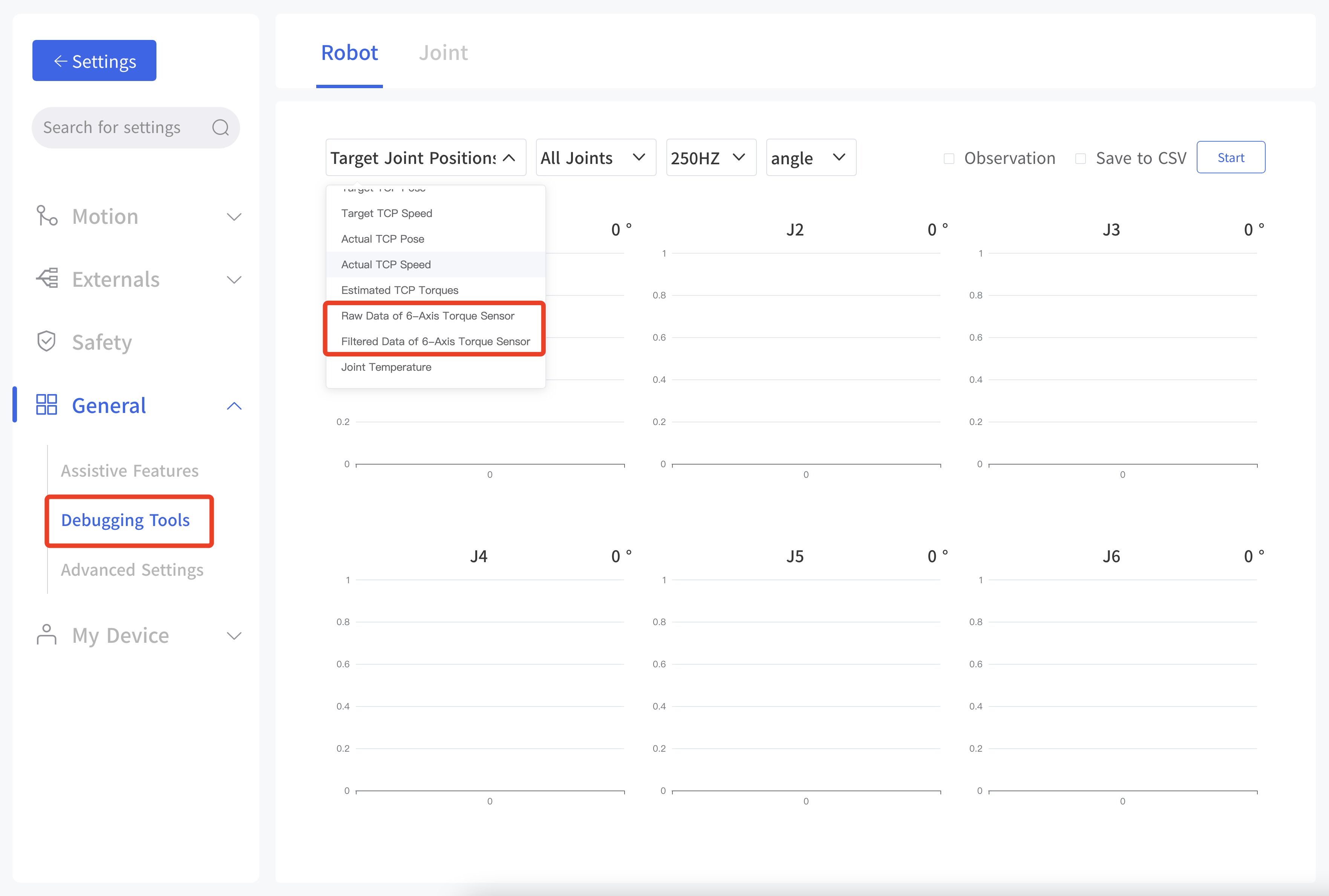 Enter Settings - General - Debugging Tools - Robot, check 'Observation' or 'save to CSV' box, click start, and obtain data via TCP port for plotting.