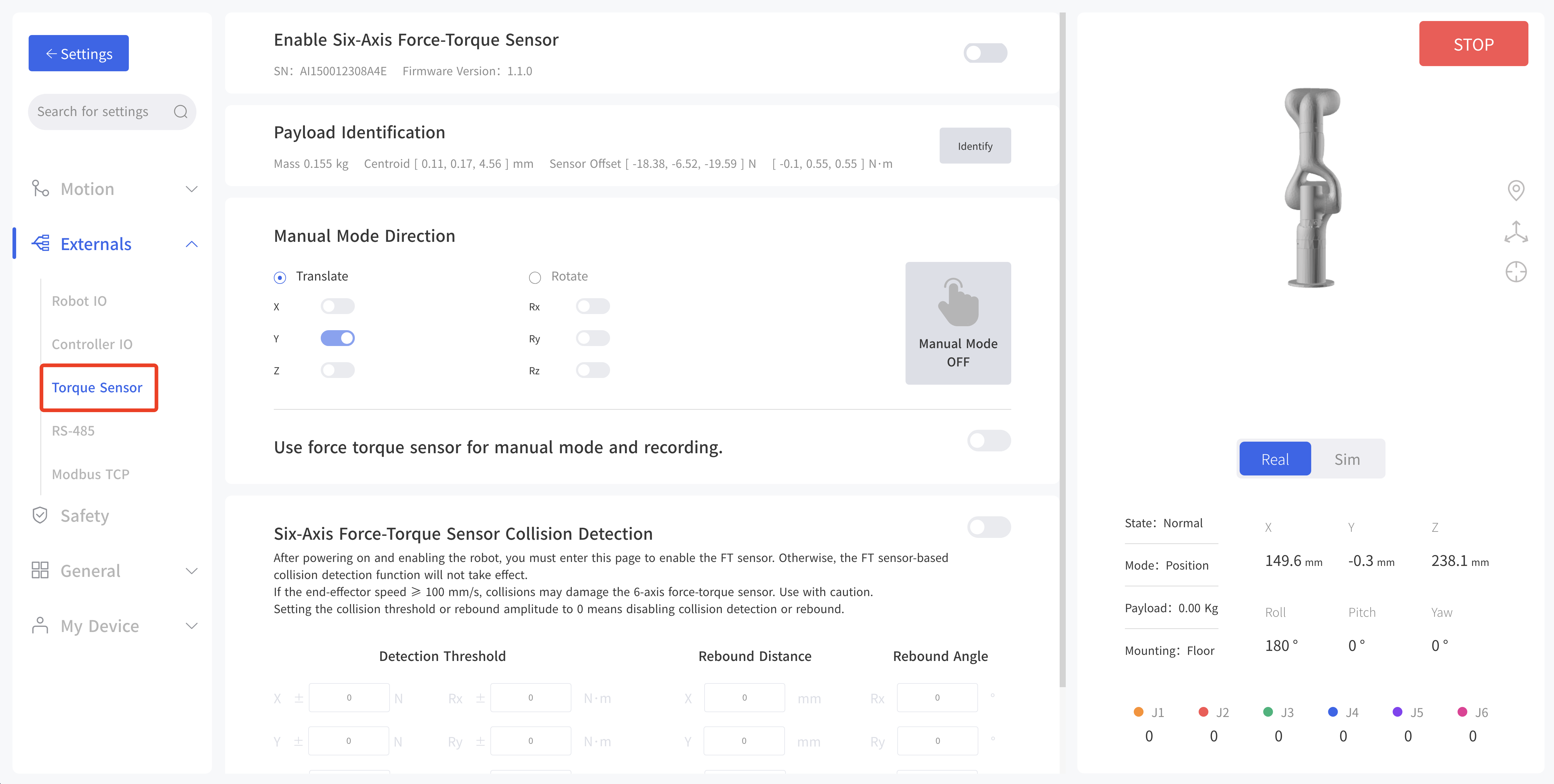 - Enable Six-Axis Force-Torque Sensor: Enable, obtain and display SN and Firmware Version.